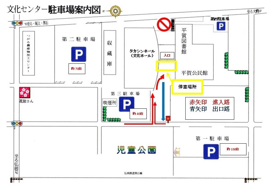 当日は、タカシン文化センターの第一駐車場・第二駐車場・第三駐車場をご利用ください。※降雪状況によっては、駐車台数分とめられない可能性がございます。