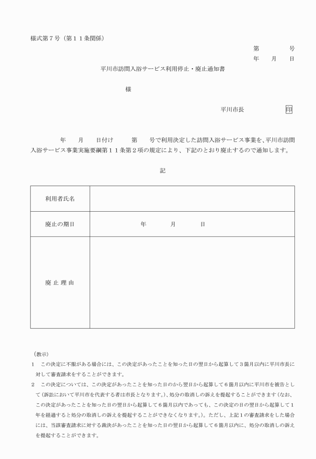 第9条 利用者等は、利用者等の状況に変更が生じたときは、平川市訪問入浴サービス利用状況変更届(様式第5号)により、速やかに市長に届け出なければならない。