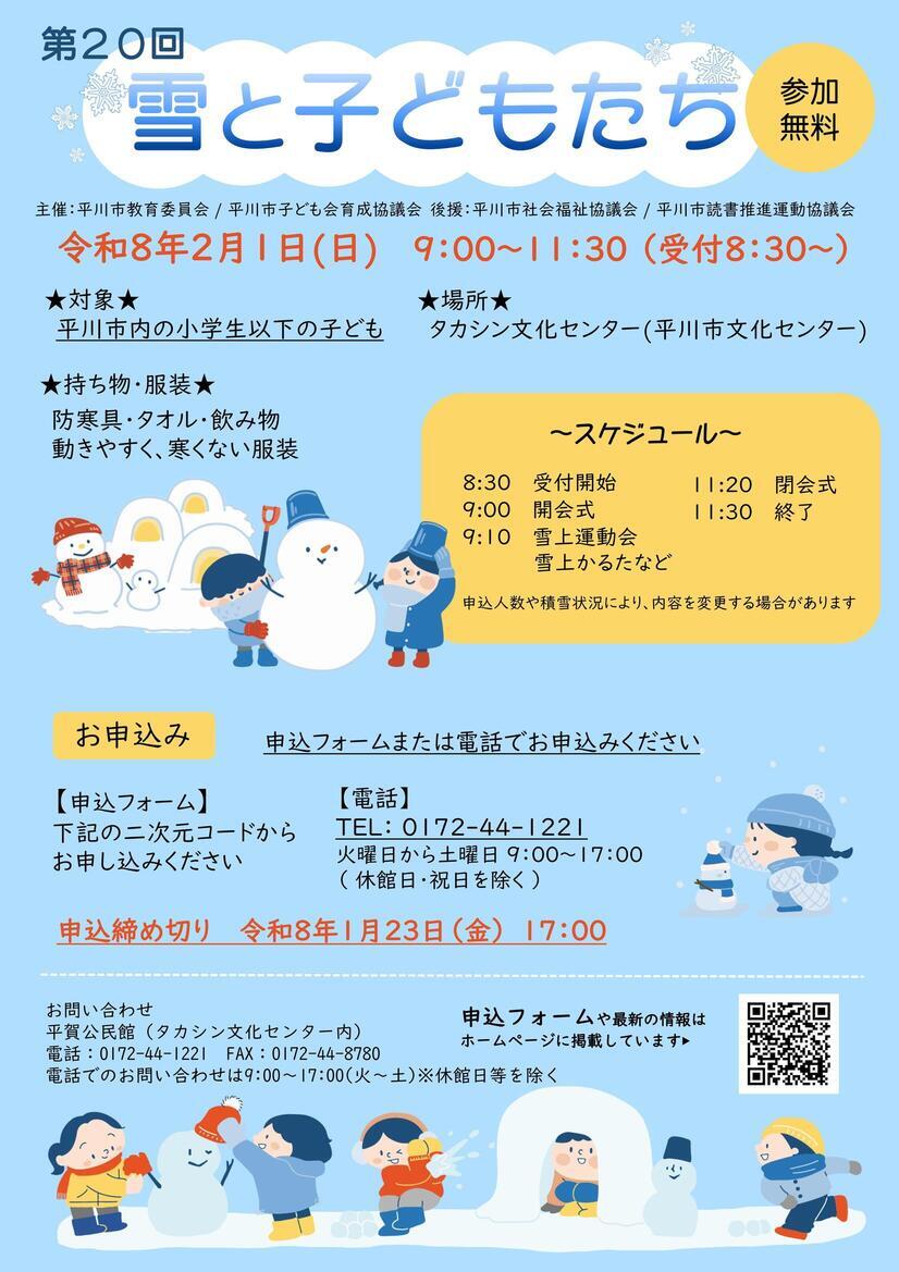 市では、冬期間、野外で遊ぶことが少なくなることから、子どもたちが雪上運動会、各種雪上あそびなどを通して、雪と親しみ、多くの仲間をつくり交流を深めることを目的として、平川市子ども会育成連絡協議会と共催して「雪と子どもたち」を開催します。